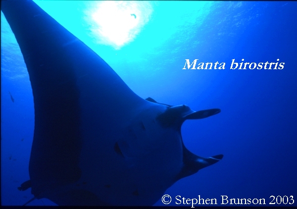 The manta ray, Manta birostris has two gigantic fins on either side of its head. They resemble large, soft paddles and are used to channel food directly into its wide mouth. The manta has no teeth, its food is sucked, along with water, into its gill arches which act as a filter. Water is then pumped back out through the gills and the food is siphoned into its stomach. The manta's filtration system is used for feeding as well as respiration. The span of the manta's winglike fins can reach 22 ft. The wingspan of a Piper Cherokee plane is only slightly longer at 26 ft. The blue whale, basking shark, and whale shark have feeding systems similar to the Manta's. Manta Rays are found in western Atlantic, Pacific, and Indian Oceans in both inshore and offshore waters.
